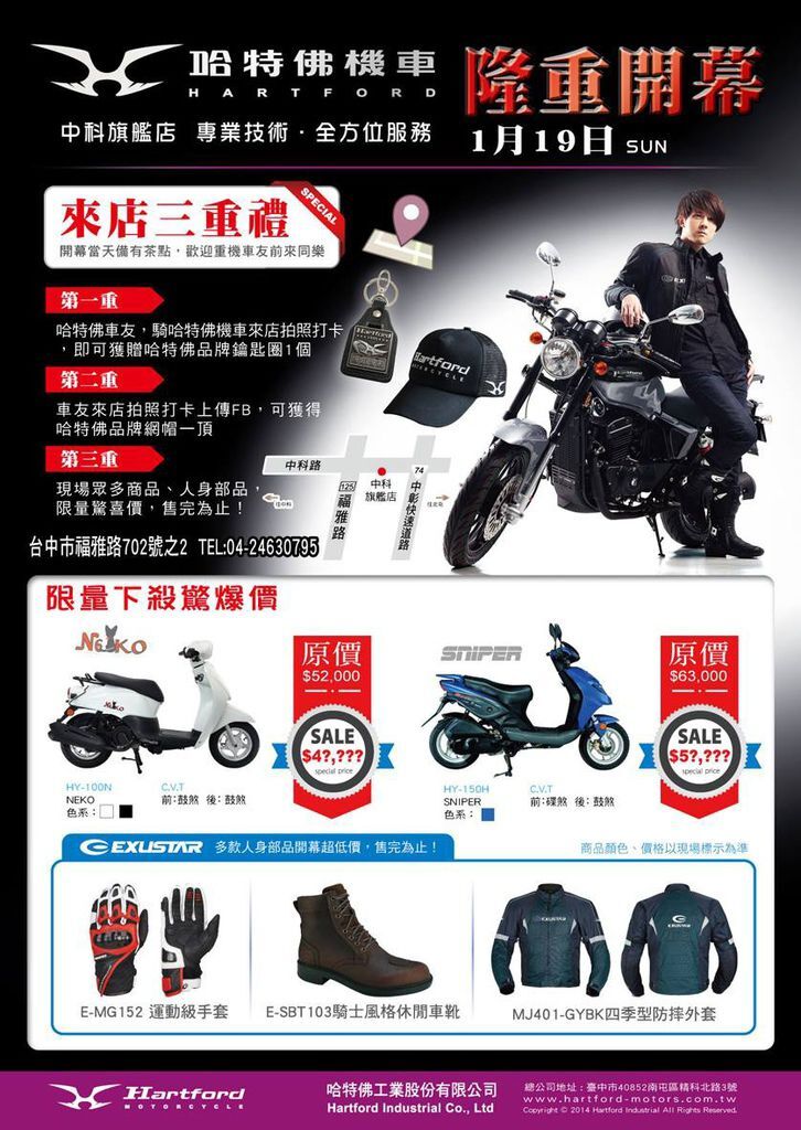 哈特佛 中科旗艦店‧將於1/19(日)隆重開幕,來店打卡就送精美贈品,現場還有人身部品超低驚喜價,歡迎車友一起來同樂。